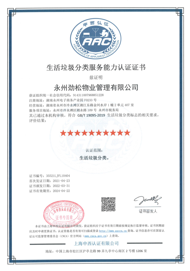 GB/T 19095-2019 生活垃圾分類服務能力認證“十星”證書